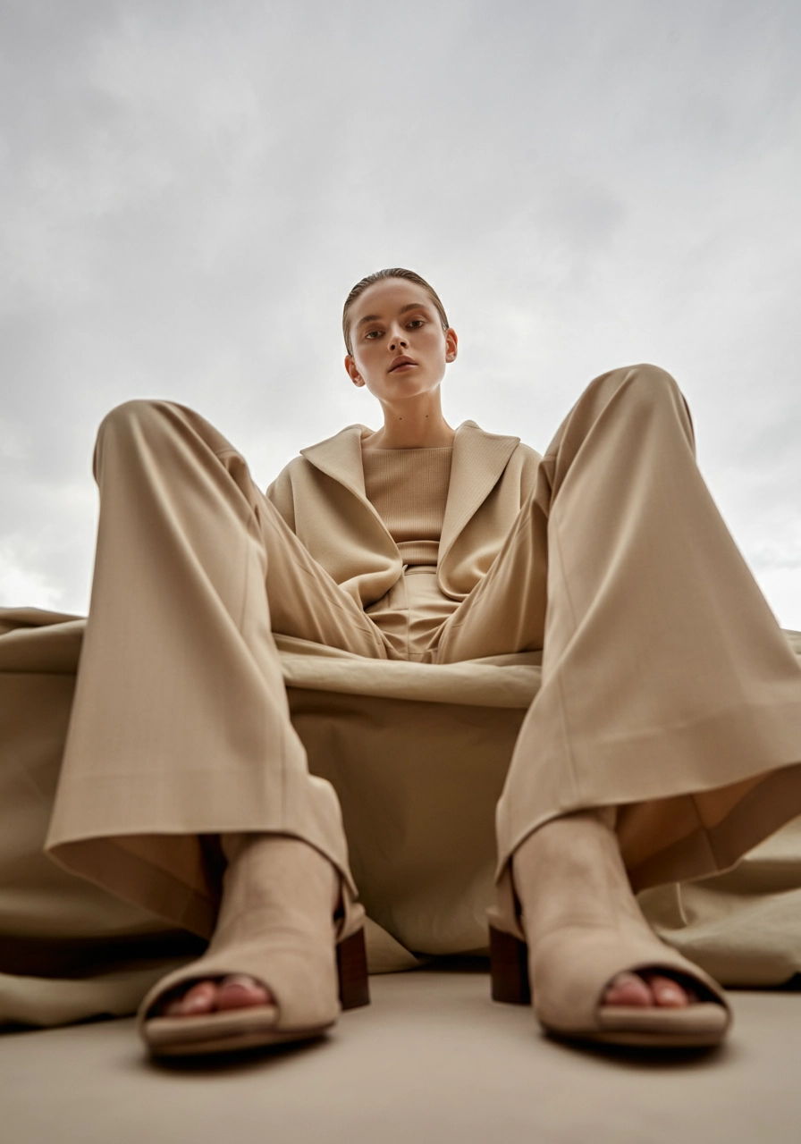 Feet to head, full body shot, low angle premium brand photoshoot of a beautiful subtle model wearing elegant zara outfit. Low-angle shot creates a sense of power, dominance, and grandeur. Beige colors.