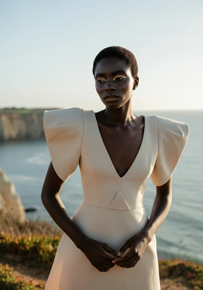 high fashion campaign, spring/summer, female Black model with short natural hair, wearing a structured Loewe-inspired cream dress with exaggerated shoulders, minimal makeup with glossy eyelids, posing on a windswept coastal cliff at golden hour, 85mm lens, DSLR, soft natural light, cinematic depth of field, subtle lens flare, fine film grain, high contrast editorial style --v 6 --ar 2:3