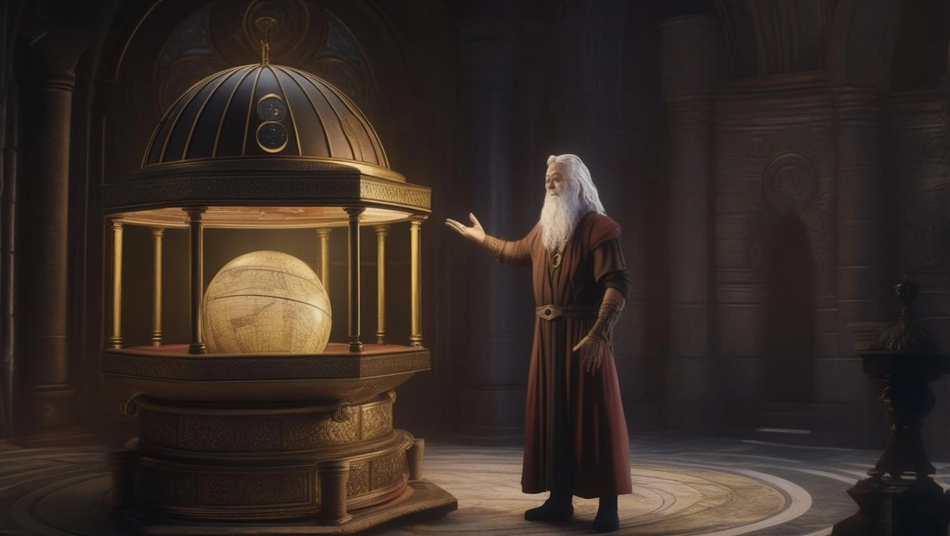 astrologer with a astrology ball inside an ancient observatory surrounded by big money