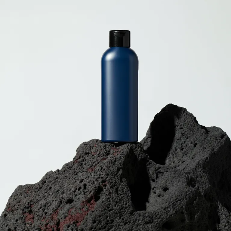 A men's cosmetic shampoo bottle standing boldly on the peak of a rugged dark rock, the rock has a rough, volcanic texture. The background is a clean white studio backdrop. The camera angle is low, looking up toward the product to create a heroic, dominant feel. Dramatic shadows and high contrast lighting enhance the texture of the rock and the sleek design of the shampoo bottle. The scene feels powerful, masculine, and minimalist.