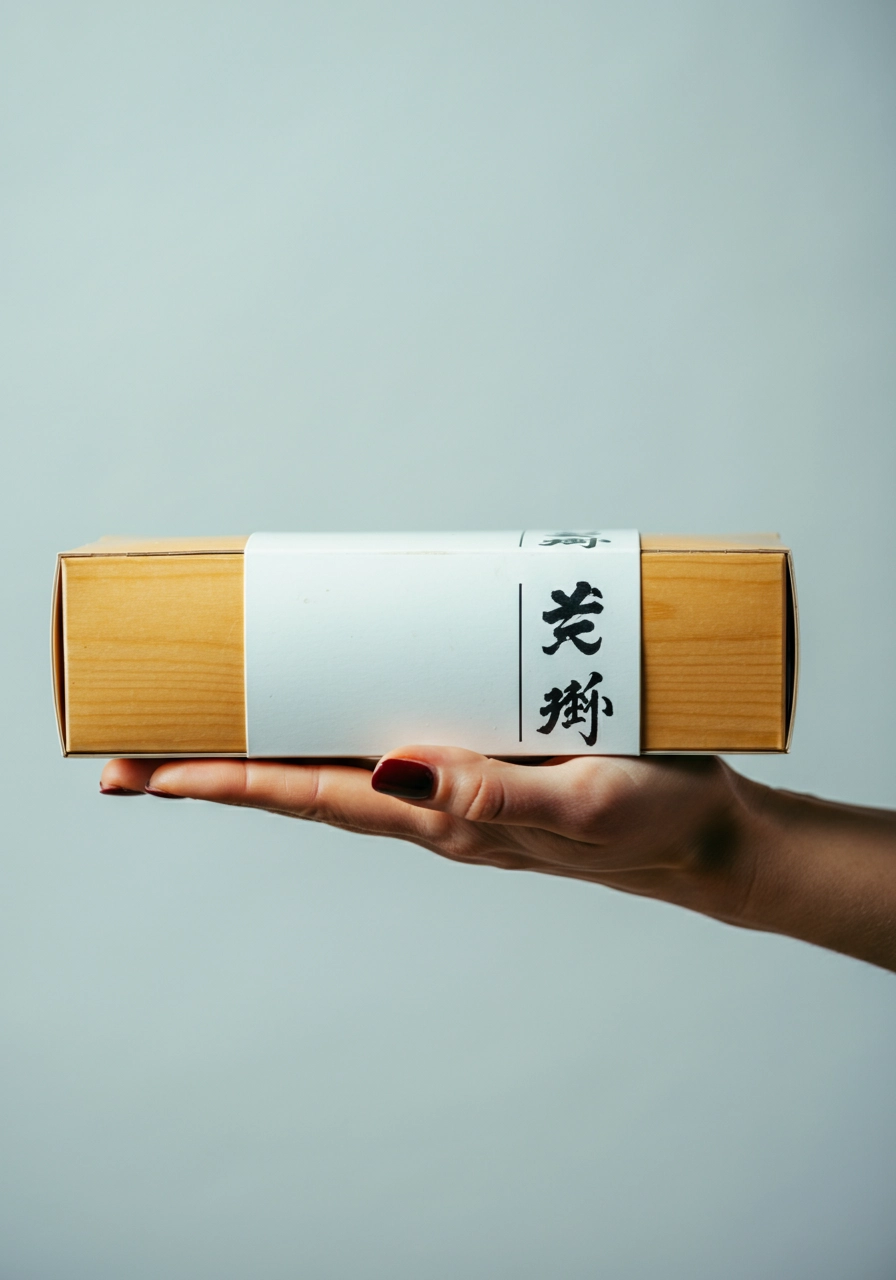 a close-up of a closed horizontal box with a “sleeve” with no inscription in which sushi is packed. the box rests on a woman's hand. Light background. studio shooting