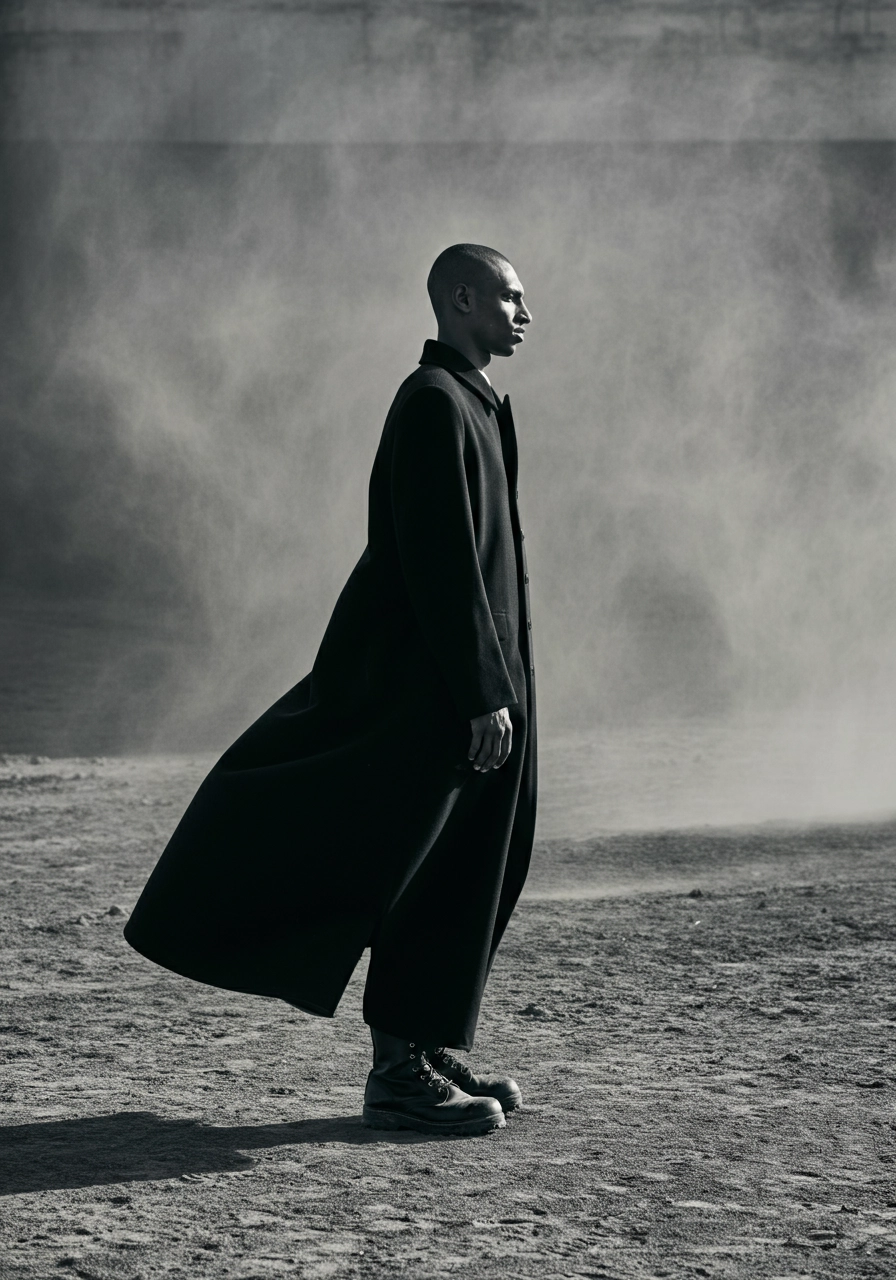 Medium: solarized photograph in style of Man Ray, motion blur, heavy distortion. Subject: full body, left side facing, male model, mixed race, minimalist fashion heavy wind. Clothing: black fishtail parka floor-length hem touching ground, scuffed military boots, shaved head. Atmosphere: dimly side lit figure, wind and dust, ground covered in thick layer of dry grey dust. Technical effects: black and white xerox copy, heavy grain, xerox copy distortion. Style reference: black and white, stylized, heavy distortion. Color palette: black and white, monotone, black silhouette, surreal, Post processing: photocopy degradation, photocopy distortion. Environment: studio setting, foggy atmosphere dim light. Composition: centered figure, full height, flat perspective. Additional details: low contrast between figure and ground, emphasis on texture and decay.