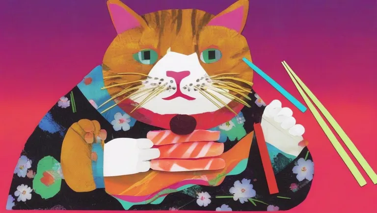 fat cat eats sushi with chopsticks delicately in neon lights