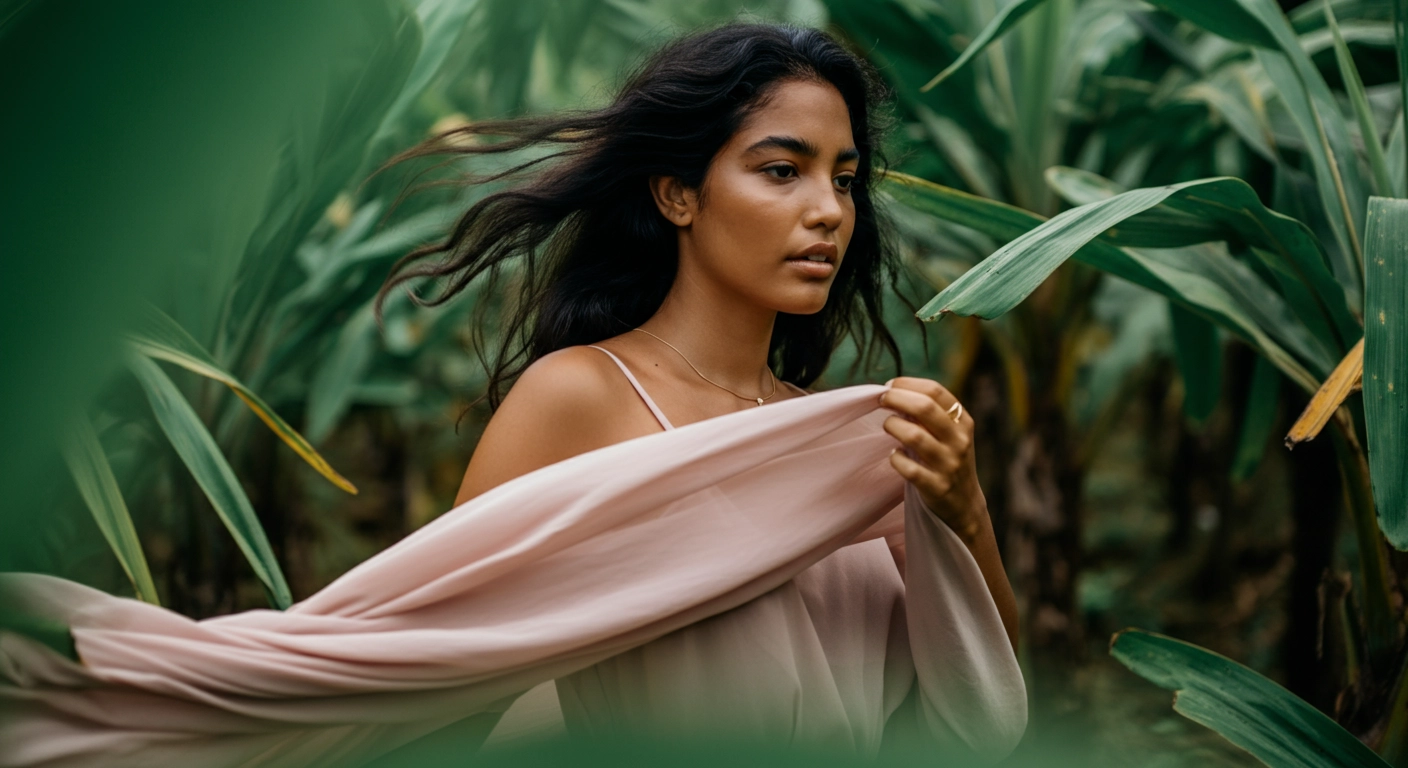 A hyper-realistic, close-up portrait of a Brazilian female model, 25 years old, with black hair, wearing a light, flowy fabric in a soft pink tone. The setting is a morning photoshoot in a plantation, with minimal background visibility. Shot with a 50mm lens, using studio flash lighting to simulate morning sunlight. The model's hair and outfit are gently swaying in the breeze. The image features a slightly blurred background, creating a depth-of-field effect, while the focus remains sharp on the model, resembling a magazine cover photo.
