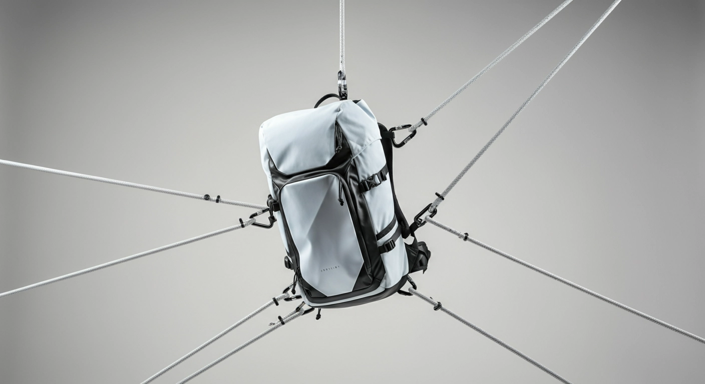 high-performance backpack suspended in mid-air, hanging slightly tilted and held in place by several tightly stretched strong white climbing ropes. The ropes are attached to the backpack with metal carabiners. The backpack has a sleek, minimalistic futuristic design with a predominantly white color, semi-translucent body. The picture is made on a light studio background