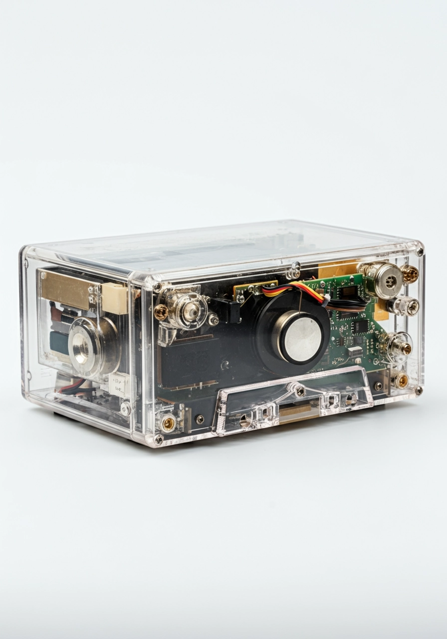 A transparent 90's Audio casset player (frosted), showing the internals on a plain white background, studio shot, evenly lit