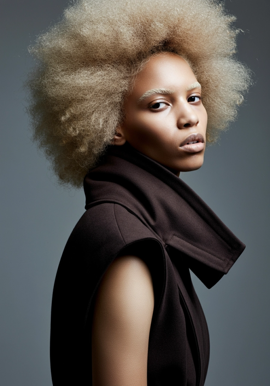 A contemporary, modern young woman with an blond afro, wearing Rick Owens fashion, looking at the camera. The background is a plain gray, focusing attention on her strong profile. The lighting is soft, casting gentle shadows to enhance the contours of her face. The composition captures her from the waist upwards, highlighting an ethereal, classic mood through the earthly palette and elegant styling. Photography in the style for Vogue Italia