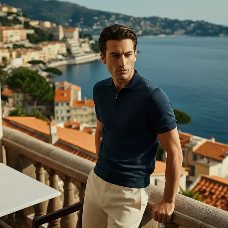 A medium shot of a man wearing a luxury knitted polo from the Riviera Collection, standing on a sunlit terrace overlooking the serene coastline of the French Riviera, embodying quiet elegance and timeless sophistication, with soft Mediterranean sunlight casting a gentle glow over the scene, shot with a Sony A7R IV, 50mm f/1.4 lens, in soft, natural colors reflecting an understated palette of earth tones and sea blues