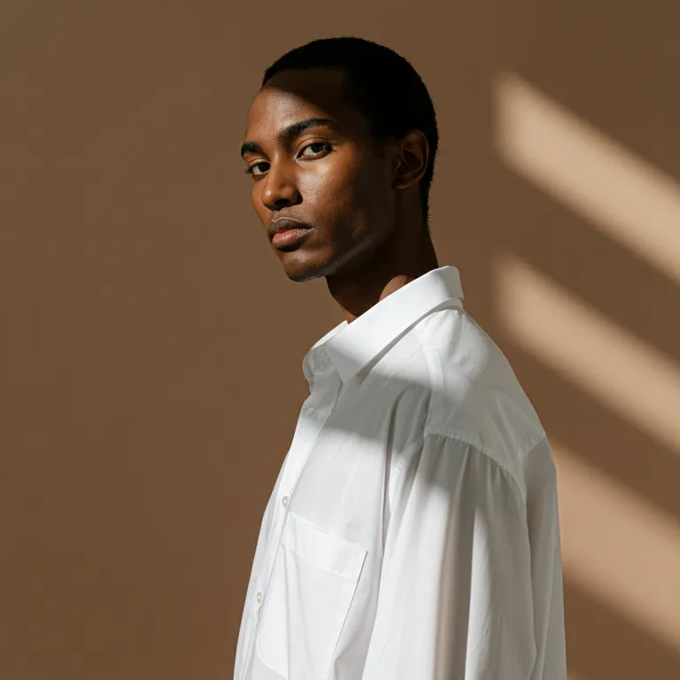 Realistic and minimalist editorial fashion style, featuring a person wearing a white shirt in a waist-up shot. The subject is elegantly posed, with subtle plant shadows cast on their face. Background in a nude palette, creating a sophisticated and stylish atmosphere for mockups. Medium shot with Canon EOS 5D Mark IV and Portrait Lens, soft golden light highlighting the subject with smooth shadows. Composition uses the rule of thirds, maintaining focus on the shirt and an elegant play of light and shadows