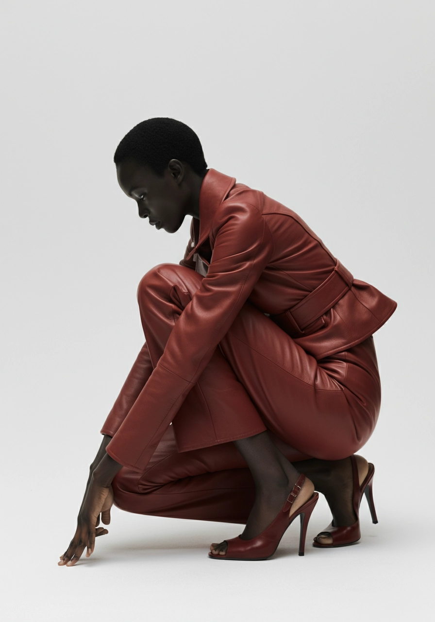 a black woman model desert red Maison Margiela leather in a white and minimal background Portray very closeup.A very hunched woman in profile like touching her feets, posed in a highly editorial manner, creating experimental compositions with her body.