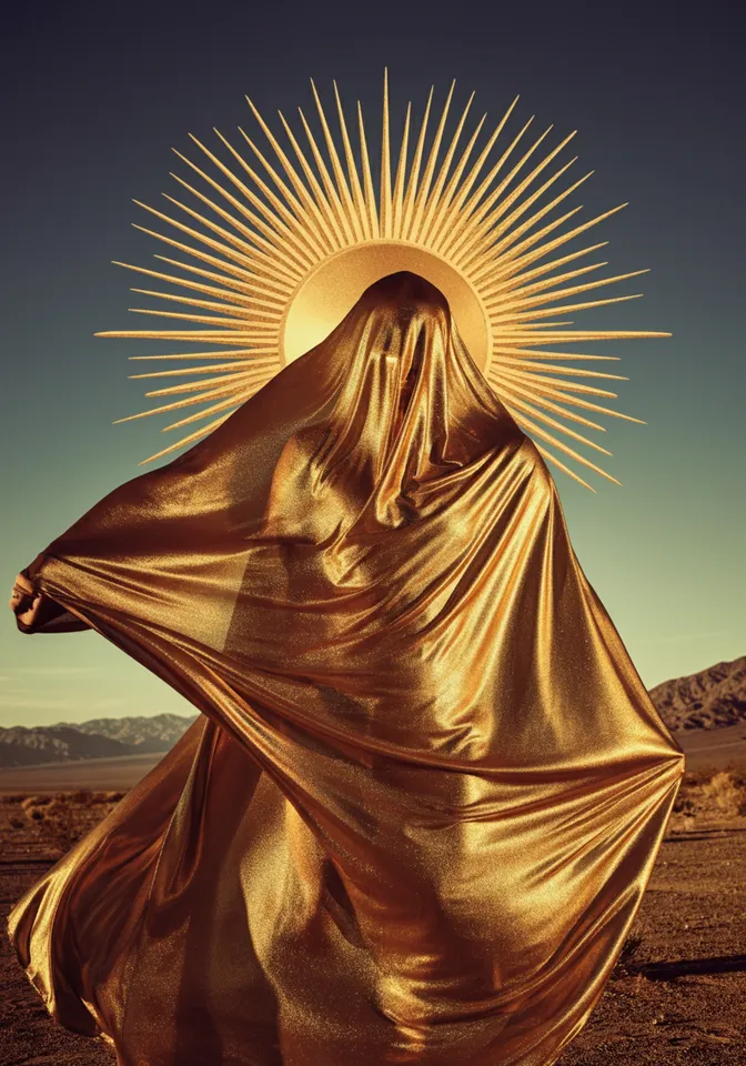 A photo of a male figure draped in a shimmering gold-colored fabric that flows dramatically around him. He is positioned against a backdrop of a vast desert landscape with mountains in the distance. Above him, there's a unique sunburst or starburst design made of golden rays emanating outward. The overall ambiance of the image is one of luxury, opulence, and perhaps a touch of futuristic or otherworldly vibe.