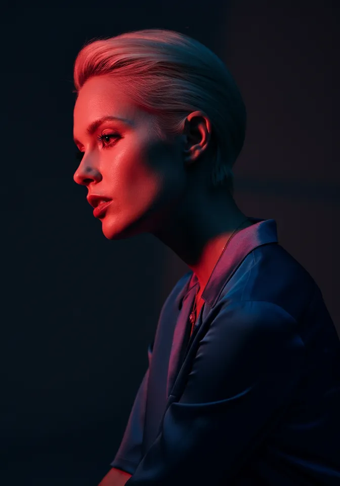 fashion editorial photo, a prettier blonde woman with short hair, blue strappy blouse, subtle necklace, in a red zone with light on her ear. The woman is sitting sideways looking at the camera, she's in a photography studio with the light coming from the window. Photo captured with a Sony Alpha 7R IV 50 mm lens. Extreme close-up, the skin has a realistic texture.