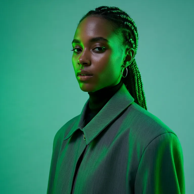 african american model. broided hair. modern office clothing. in a studio with neon lights green and blue.