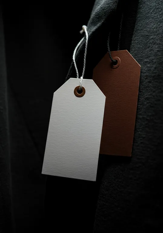 A close-up of minimalist clothing tags hanging from a garment in a dimly lit environment. One tag is plain white with , and the other is dark brown. The setting emphasizes a stylish, modern, and slightly moody tone with textured dark fabric in the background, illuminated by soft directional lighting.