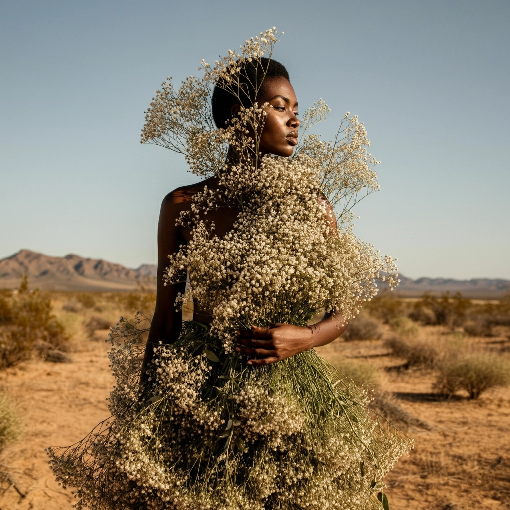 Nesta imagem, uma mulher negra nua caminha pelo deserto, coberta por flores que brotam em meio à aridez. O deserto, com seu solo rachado e suas paisagens desoladas, reflete as dificuldades e desafios da vida. No entanto, as flores que vestem o corpo dela trazem a mensagem de que, mesmo no ambiente mais hostil, há espaço para florescer.