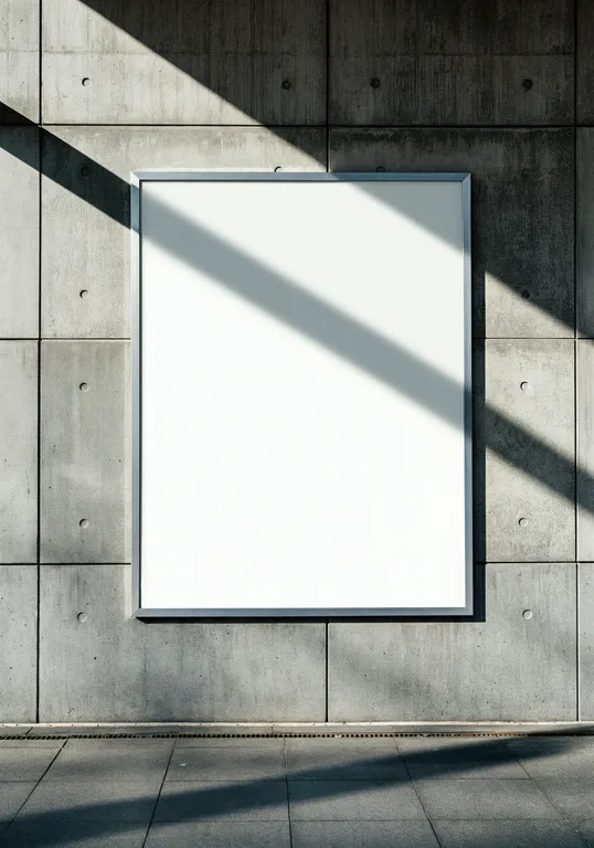 One metal framed A0 poster on a concrete wall outside. the poster is blank white. the poster covers 80 percent of the image. light filtering through. The composition is balanced, emphasizing minimalistic and modern design elements.