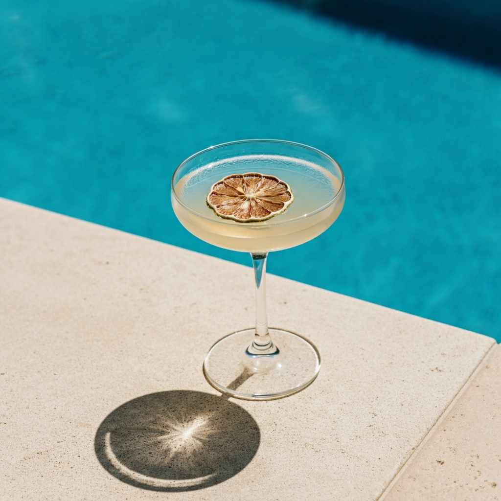 A clear, elegant cocktail glass with a light, refreshing beverage is placed on a light-colored stone surface near a swimming pool. A thin slice of dried lime floats on the surface of the drink. The turquoise blue of the pool adds a cool contrast to the warm tones of the stone tiles. The strong sunlight casts a sharp shadow of the glass on the surface, emphasizing the bright, summery atmosphere. The composition focuses on the drink with a top-side perspective, creating a relaxed, tropical mood.