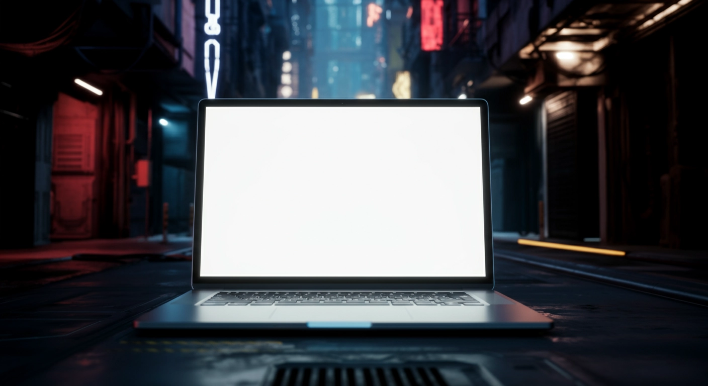 minimalist mock up of a laptop in a unrealengine landscape edgy futuristic cyberpunk cityscape. the laptop if facing the camera, is in the center, it has a blank white screen and is the main focus