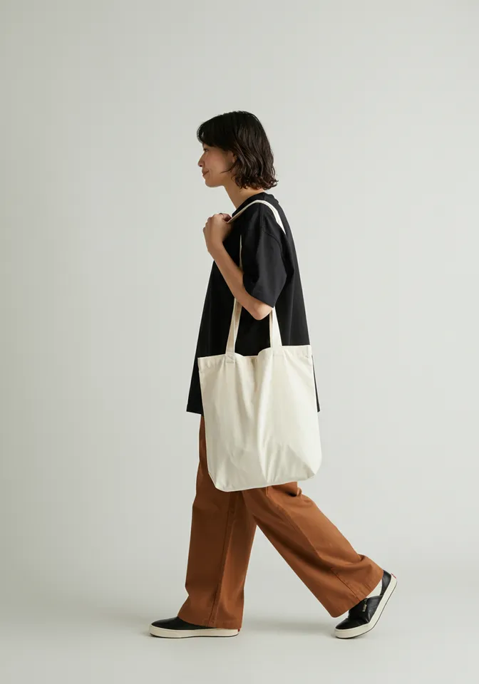A minimalist scene showcasing a person walking while carrying a plain white cotton tote bag over their shoulder. The person is dressed in a black oversized T-shirt and loose brown pants. The background is a clean, white studio setting with soft lighting, emphasizing the tote bag and the casual, modern aesthetic of the outfit. uniqlo.