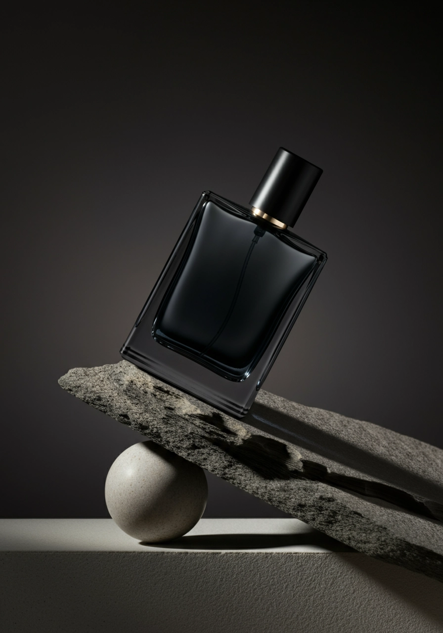 A sleek black perfume bottle is positioned dramatically on the edge of a thin textured stone ledge and sphere stone. The stone ledge is on top of the Sphere. The background is a deep, dark gradient, enhancing the luxurious and mysterious atmosphere. The lighting is moody and focused, highlighting the bottle's glossy surface and the stone's rugged texture. The minimalist composition and side perspective create a sense of elegance and sophistication, emphasizing the contrast between the smooth glass and the rough stone.
