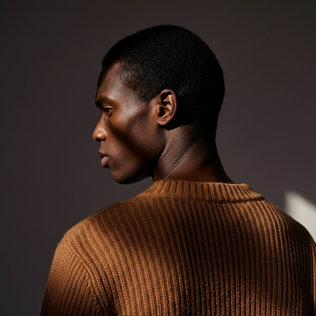 A pastel photograph of the back profile view of an African American man with black hair, wearing a brown sweater, taken from behind against a solid background. The photo captures intricate details like natural skin texture, shadows cast by the sun, and soft lighting that enhances their depth and form. It's a high-resolution image showcasing the model's style and elegance in the style of Tim Walker