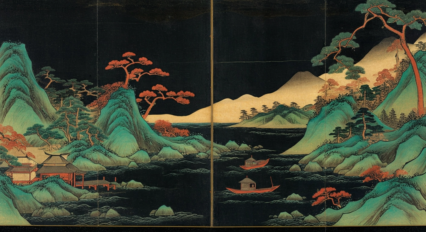 A traditional Japanese painting with a black background in the style of orientalist landscapes. The painting features light emerald and red colors, with narrative paneling. The calm waters and mountainous vistas are depicted in a naturalistic style. The painting also features kintsugi.