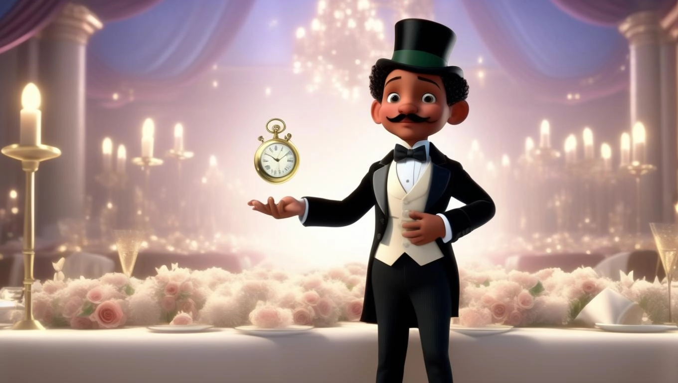 1920s image of a baby with a curly mustache wearing a tuxedo and carrying a pocket watch. he is also wearing a monocle and a top hat. the background is a gala event surrounded by wealthy aristocrats, the rabbit is the focal point, while everyone else fades into a slight blurred background. AR 16:9