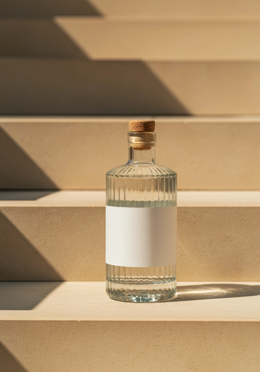 A bottle of gin, with a blank white label, stands prominently on a smooth, beige stone surface. The rectangular glass bottle has a ribbed texture and a cork stopper. The background consists of beige stone steps bathed in soft, natural light, casting gentle shadows. The color palette is warm, featuring various shades of beige and amber. The composition is centered, with a focus on the bottle, creating a sophisticated and elegant atmosphere.