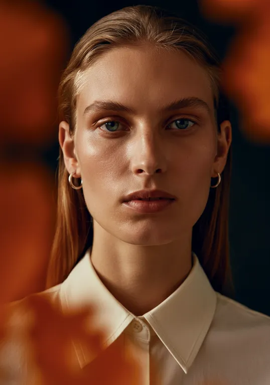 A striking portrait of a white female model smiling exuding a sense of calm confidence and elegance, perfectly aligned with Zara’s understated and sophisticated aesthetic. The model is captured in a close-up shot, with the focus on her face, which is framed by soft, out-of-focus orange natural elements in the foreground, adding depth and a dreamy quality to the image. The model’s expression is serious yet smiling, with a direct gaze that engages the viewer. His skin, beautifully lit, shows a rich texture, with subtle highlights and shadows enhancing the contours of her face. she has long hair, neatly styled, and wears a simple, clean-cut shirt with a sharp collar, buttoned up for a polished look. A small hoop earring in one ear adds a touch of modernity and edge to her otherwise classic appearance. The background is soft, rich black and blurred, ensuring that all attention is on the model's face and the details of his expression. emphasizes the play of light and shadow, creating a timeless and sophisticated mood. The overall composition is minimalist and elegant, with a focus on the model’s natural features and the subtle details of the clothing, capturing the essence of Zara’s modern, refined style.