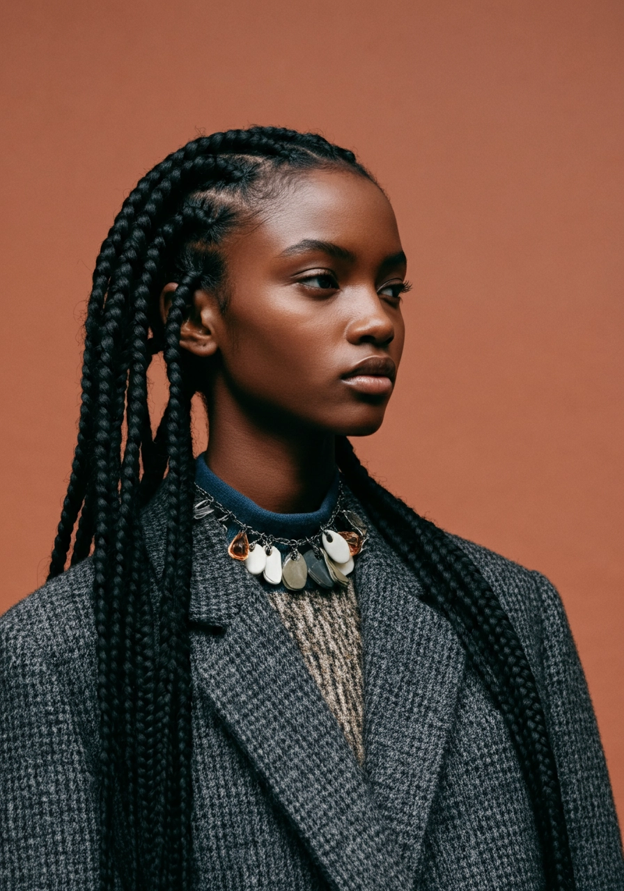 A kintsugi stone of an African American woman's braided hair styled in pigtails has a solid color background.