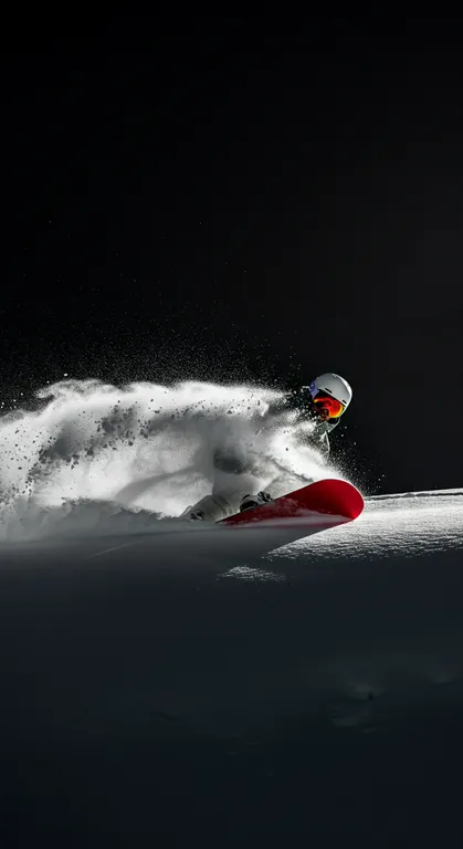 A black-and-white close-up action shot of a snowboarder slicing through fresh powder. Only the lower half of the rider is visible, with the snowboard prominently featured as it cuts through the snow. The spray of snow particles creates a dynamic, high-energy effect, filling the frame with motion. The minimalist composition emphasizes the power and speed of the snowboarder, leaving the background clean and unobtrusive. rider have a red snowboard, like a korua snowboards