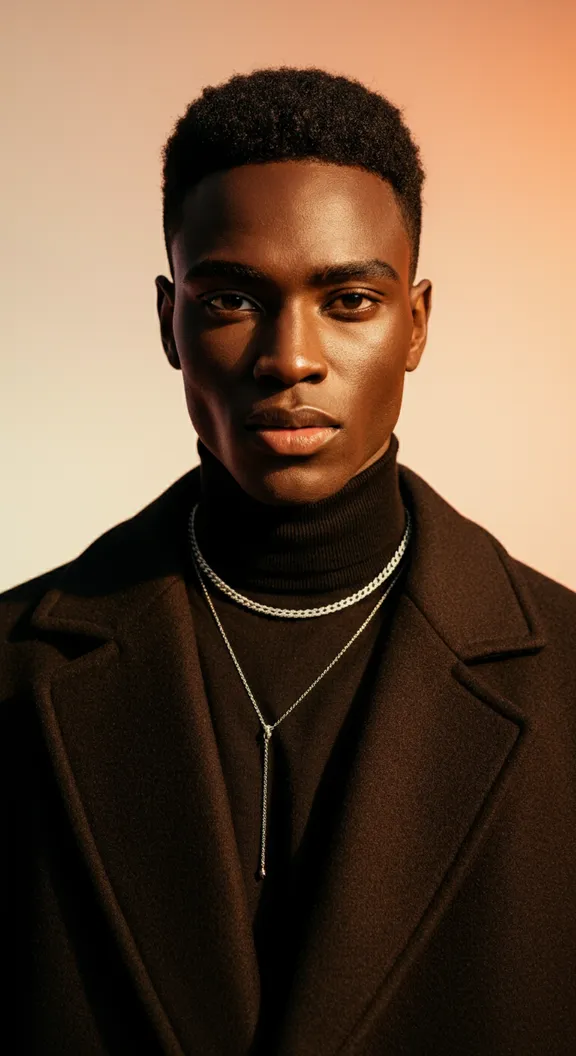 Black male supermodel portrait, looking into the camera, fashion photography