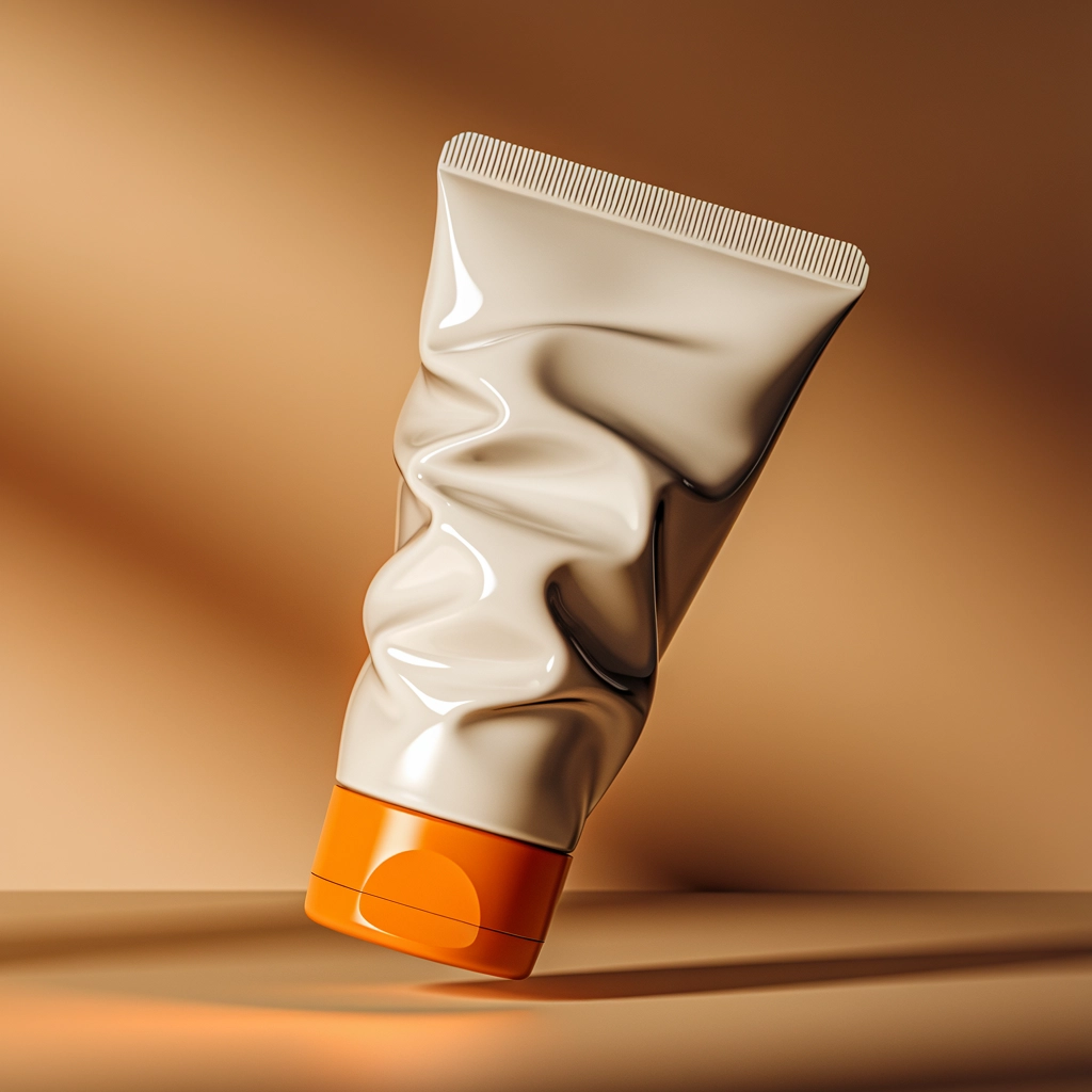 Minimalist, surreal composition. A white, slightly crumpled cosmetic tube with an orange cap, floating in mid-air. The folds on the tube are subtle and natural, giving it a premium look. Soft, diffused lighting creates a realistic effect with gentle highlights. The background is a warm beige with a sharp but soft-edged shadow for depth. High-quality render, realistic textures, and professional product photography style.