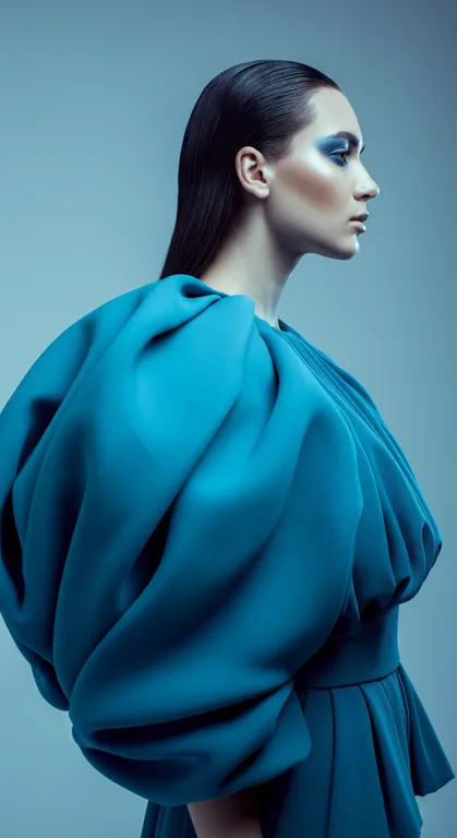 A woman with a sleek hairstyle wears an avant-garde, voluminous blue garment with textured, flowing sleeves. Her profile is captured from a side angle, highlighting her contemplative expression. The background is a minimalist gradient of pale blue, enhancing the futuristic feel. The lighting casts soft shadows, and the dominant cool blue color scheme adds to the ethereal and otherworldly atmosphere. The composition focuses on the dramatic silhouette and textures of the outfit, creating a surreal, artistic ambiance.