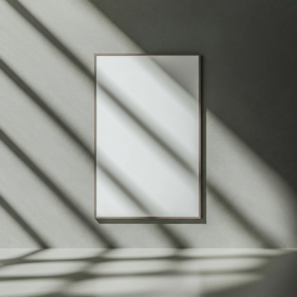 A sleek blank poster mounted on a wall in a brutalist modern architectural and well-lit environment. The lighting creates subtle shadow on the light surface beneath. The focus is on the poster, with a minimalistic composition. The color scheme is neutral, dominated by soft earth tones and grays, creating a calm and modern atmosphere. Rays of natural light are leaking into the composition. The perspective is eye-level, emphasizing the clean design and sophistication of the scene.