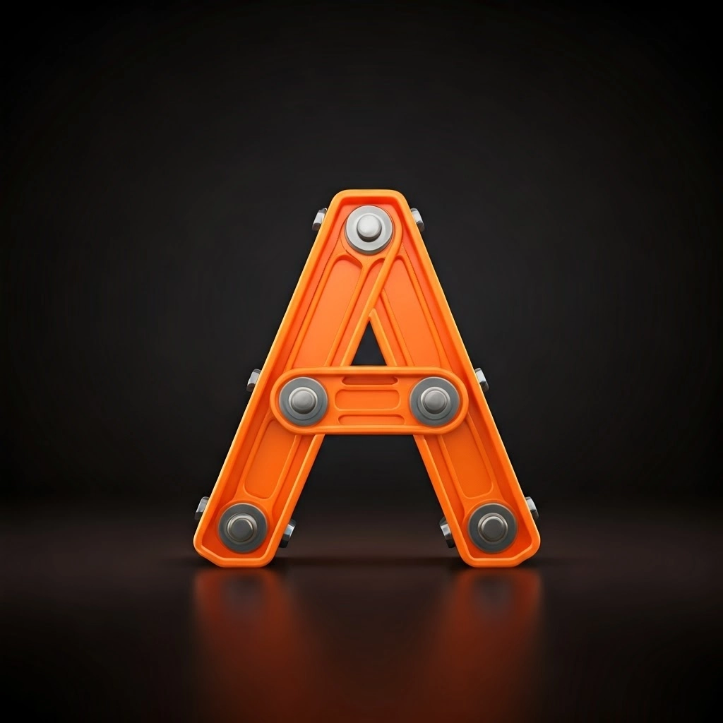 A 3d logo with the letter "A" made as an orange plastic steel beams bolted together toy on a dark background