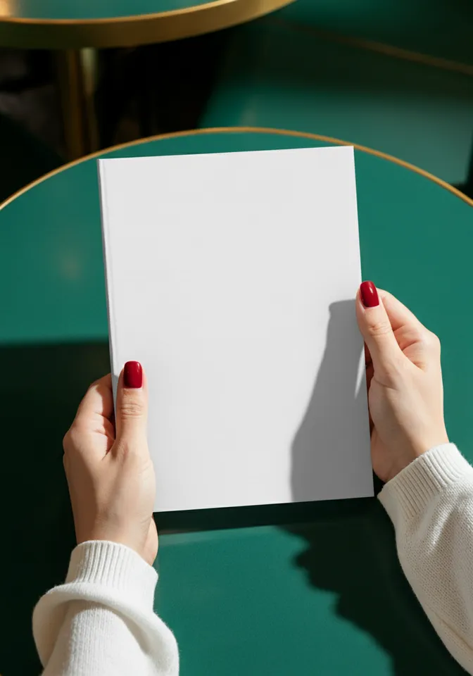 Artistic lifestyle photography of a white hand with with short red-colored nails holding a white Matte Magazine (vertical) size: 21X29.7CM against a stylish green cafe table setting. Shot from above, showing hands with white sleeves holding holding a white Matte Magazine (vertical) size: 21X29.7CM. Background features a soft-focus modern green cafe table with a decorative gelato dish. High contrast photography with bright lighting, strong and defined shadows, dramatic shadows, and artistic composition. Premium restaurant atmosphere with geometric elements or tiles visible. Shot style should be editorial and design-forward rather than commercial, emphasizing negative space and modern composition.
