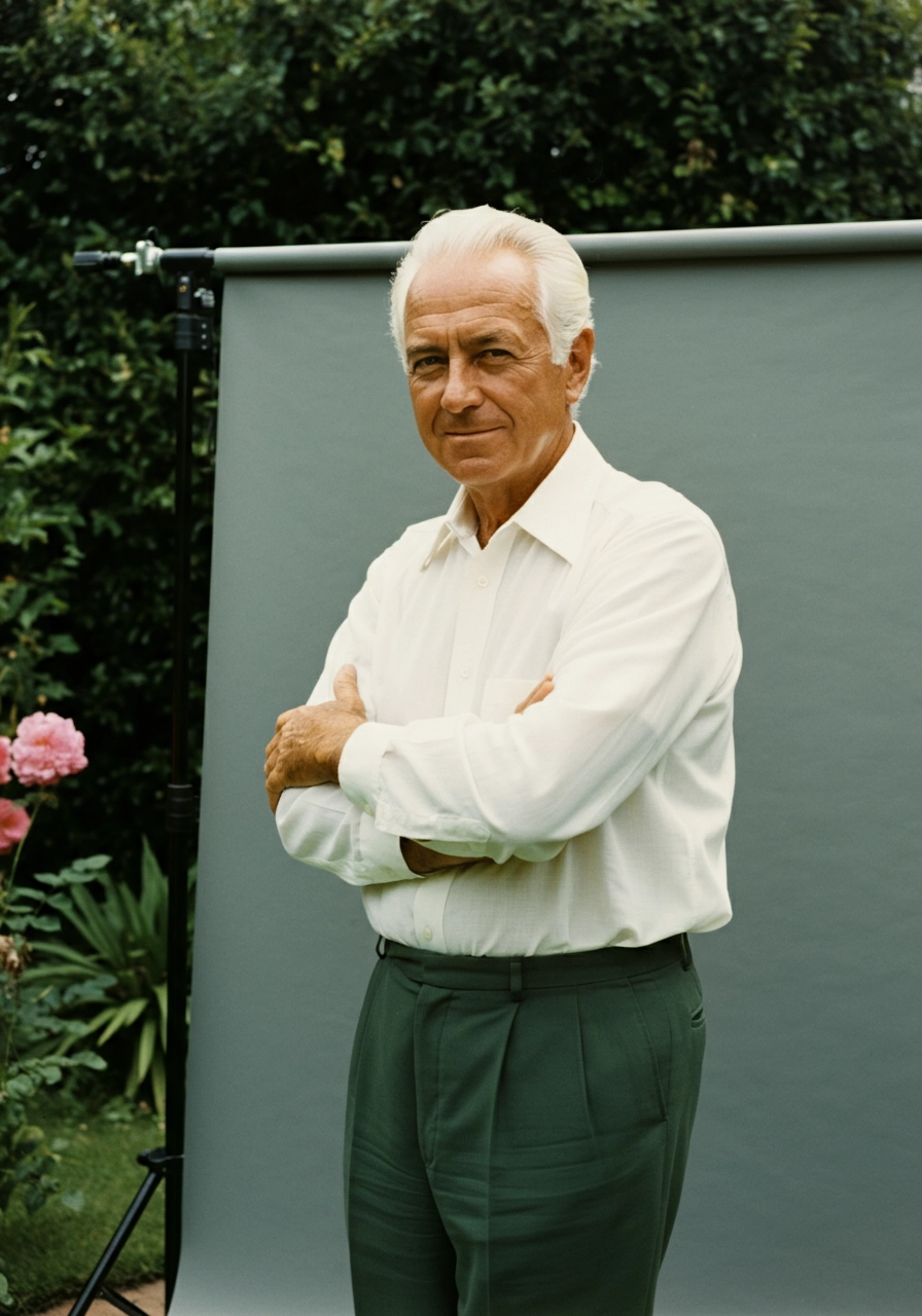 Close-up on a 60 year-old man with white full short hair and a subtle expression stands body tilted sideways confidently with arms crossed. He wears a white shirt and dark green pants, exuding a dignified appearance. The neutral gray backdrop has a discreet metal support on itscreen set up outdoors, surrounded by lush greenery and vibrant flowers. The lighting is soft and natural, enhancing the serene garden atmosphere. The composition centers on the man, providing a clear, full-body portrait set against the textured backdrop. The mood is calm and composed, with a touch of elegance.