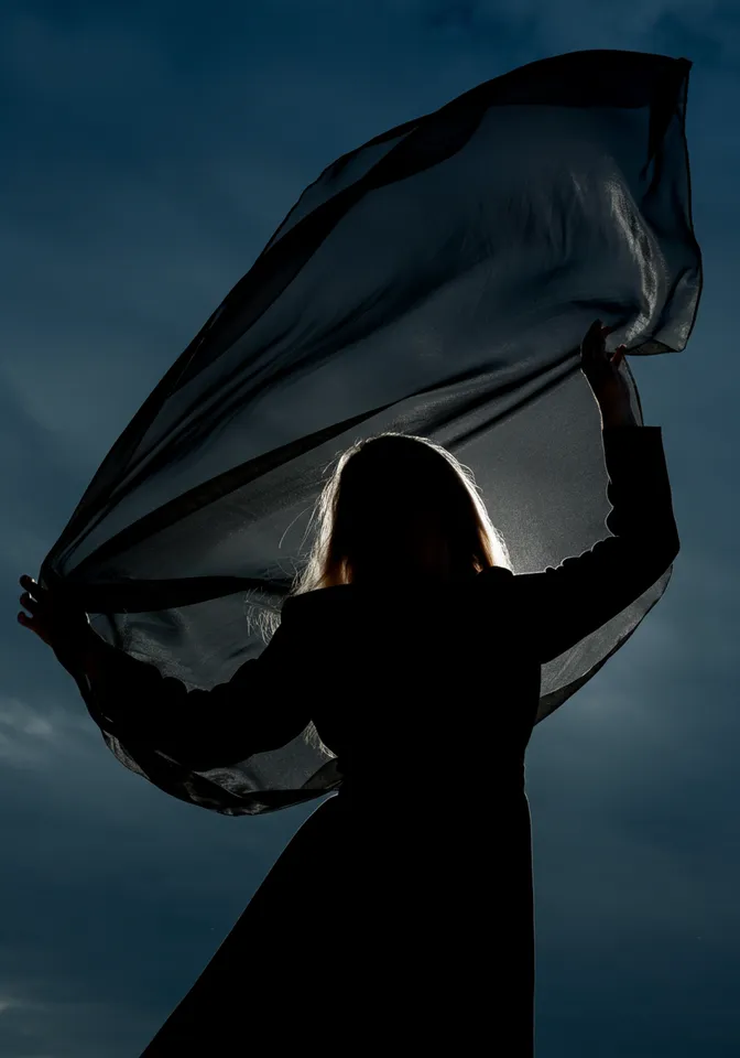 A figure clad in flowing black fabric strikes a dynamic pose against a deep blue sky, partially obscured by the sheer material cascading around them. The image captures motion with the fabric billowing dramatically, creating a sense of freedom and grace. Soft natural lighting highlights the silhouette, enhancing the contrast between the dark clothing and the bright sky. The composition focuses on an upward perspective, emphasizing the elegance and fluidity of the scene, with a serene and contemplative atmosphere.