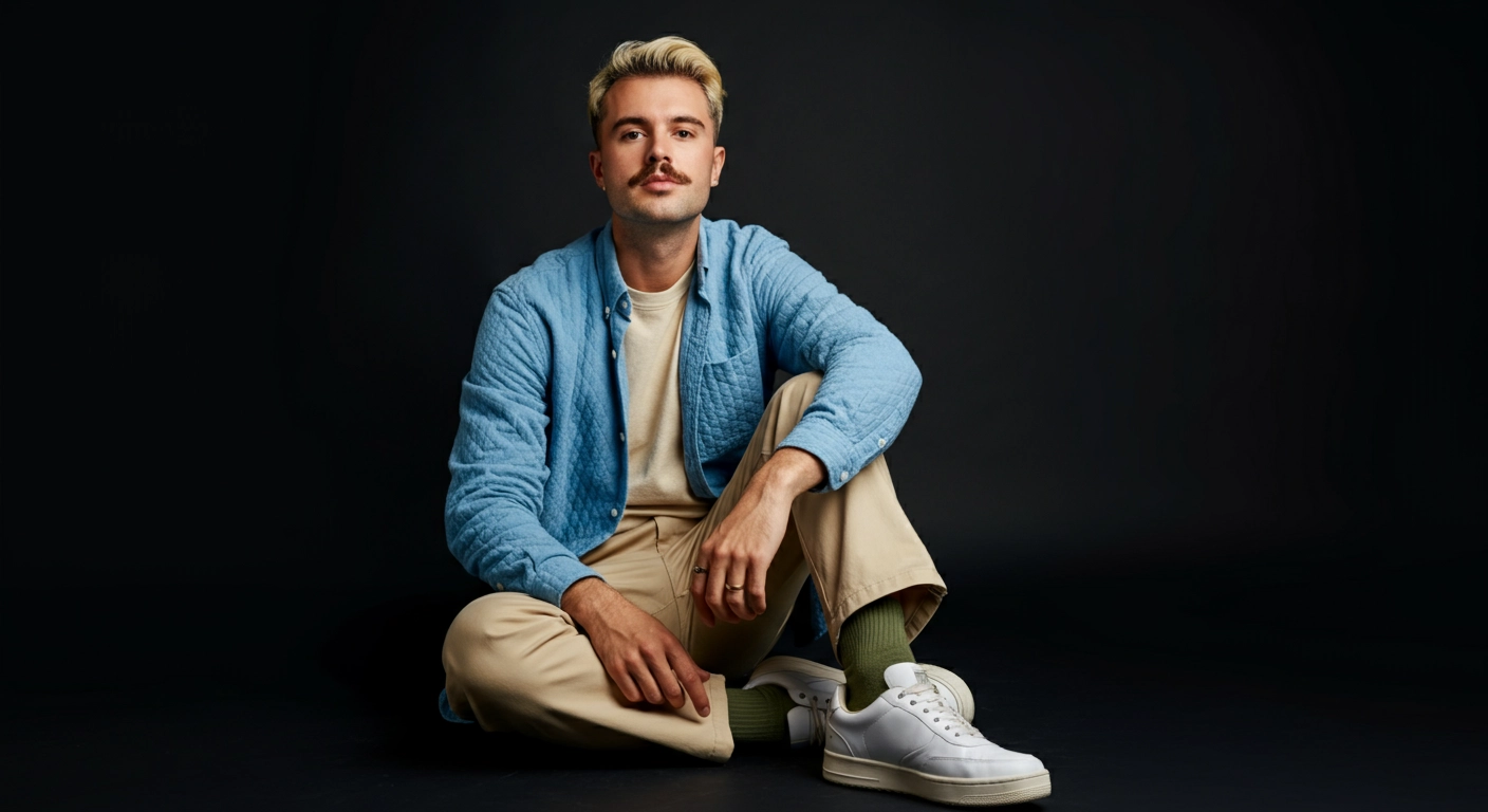 A 30-year-old man with dark blonde hair, stubble, and a mustache, sitting against a black background. He is wearing an untucked office shirt in quilt blue, beige cargo pants with pockets, light olive socks, and white sneakers.