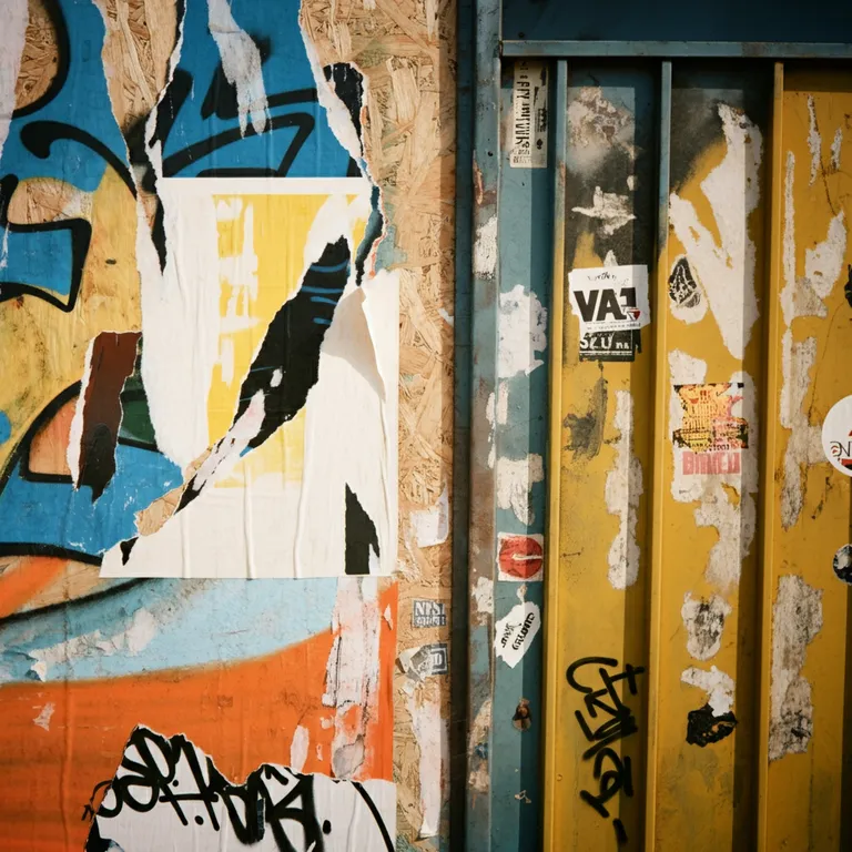 up-close, close up, abstract street art wall, sign painter torn grunge posters, stencils, wheatpasted posters, LA gang style graffiti tags on plywood. Oil stick tags on metal frame to right of composition with peeling paint and stickers. gritty grainy shot with even exposure.