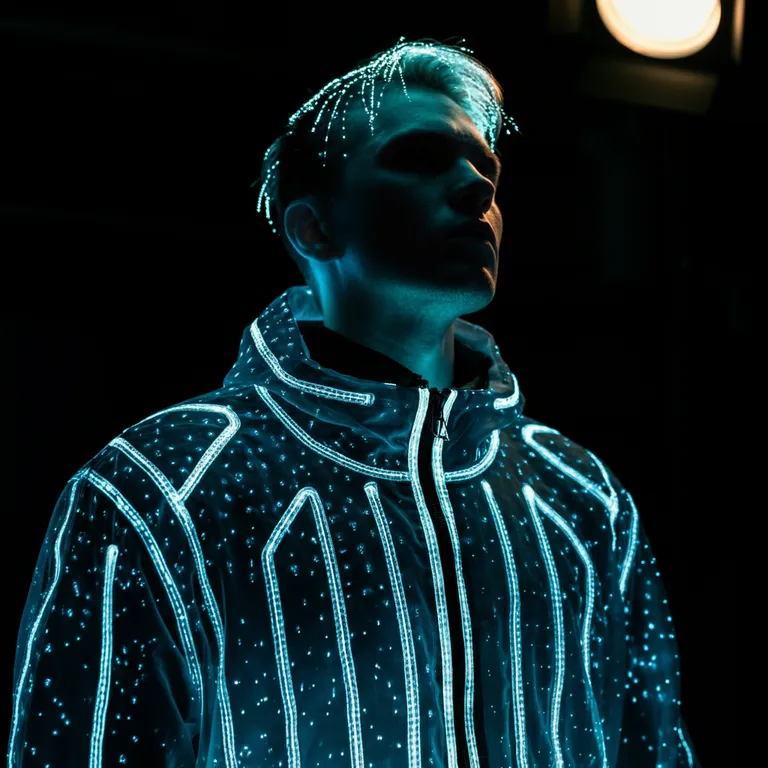 Close-up of an illuminated fiber-optic light jacket with detail lines on a male model photographed from a low angle in a studio environment, studio light creating strong shadows, ultra-detailed HD