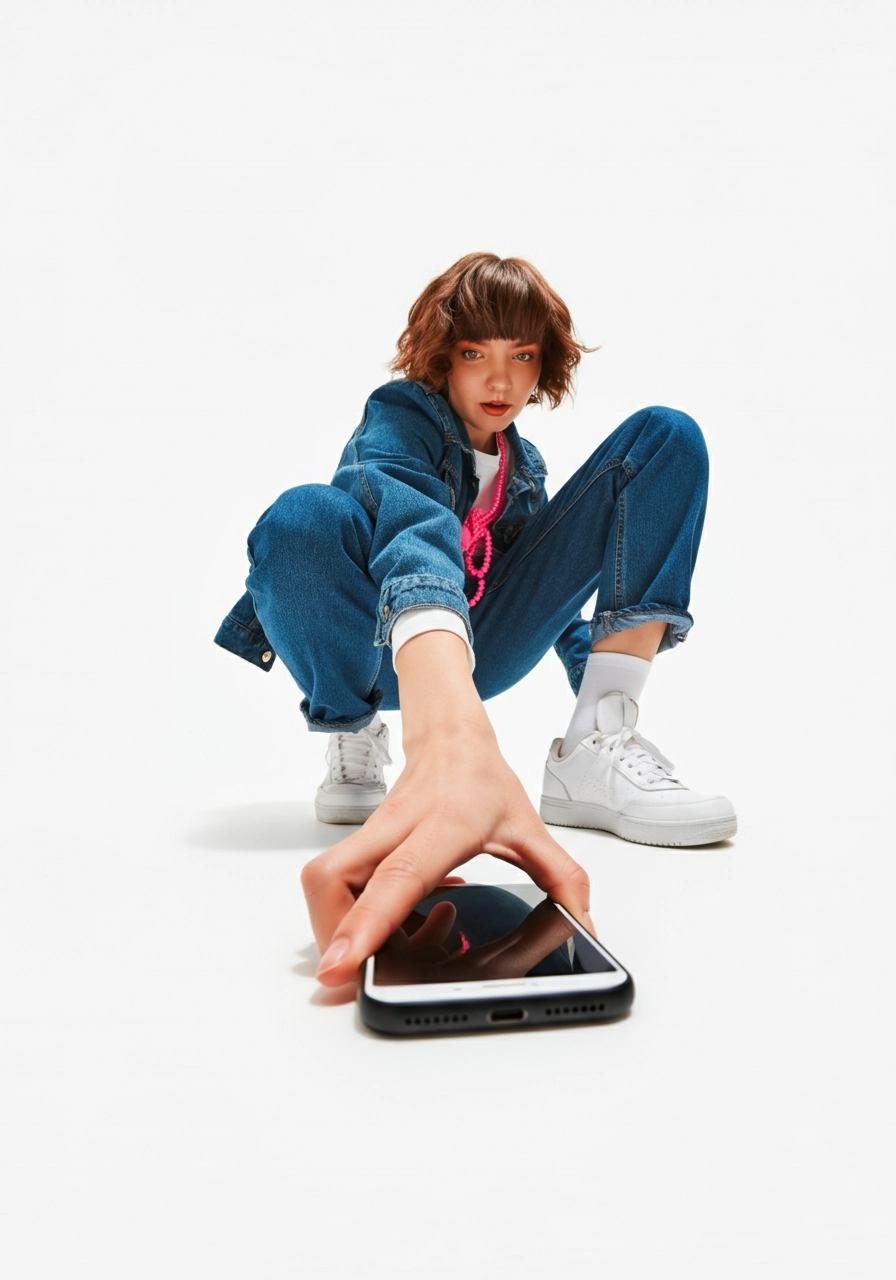 A stylish 20 year old woman in a bold, dynamic pose, emphasizing the smartphone they hold in their hand. This person has vibrant, modern clothes on. The image is shot with a wide-angle lens, which creates a dramatic perspective by exaggerating the proportions and making the foreground elements appear larger. This is evident in how the item held by the person dominates the lower part of the image, appearing much larger than it would normally due to its proximity to the camera. The wide-angle effect also elongates their arm and makes their body taper off toward the top, creating a dynamic and slightly distorted look that adds to the sense of movement and energy. The person’s proportions are intentionally altered by the lens, with their lower body appearing elongated and their upper body, particularly their head, appearing slightly smaller in comparison. This kind of lens is often used in fashion or tech photography to create a striking visual impact, drawing the viewer's eye to specific elements. The angle of the shot is low and upward, further enhancing the dramatic effect by making the person appear taller and more imposing, while also making the item the focal point of the image. The combination of the wide-angle lens and the low-angle perspective contributes to a modern, edgy feel, with a strong emphasis on the product being advertised. The background is pure white. The overall vibe is trendy, youthful, and energetic, with a strong emphasis on modern technology and fashion.