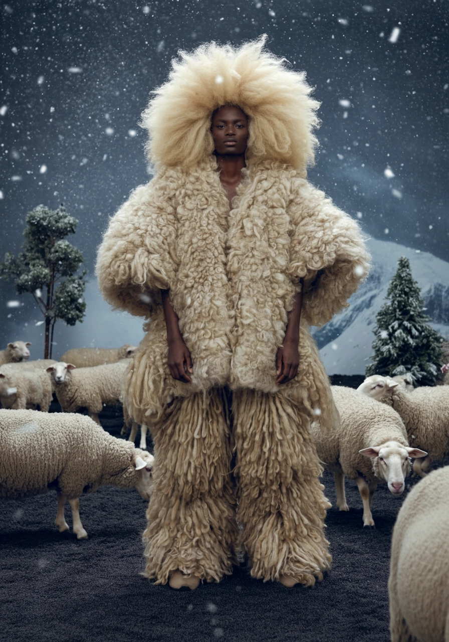 Black model, thick, wild, giant albino-beige wool dreadlocks. very large, thick, beige woolly sheep’s clothes. surrounded by sheep and big wool trees. wool snow falling. everything is made out of sheep’s wool. model matches the sheep. snowy mountain top