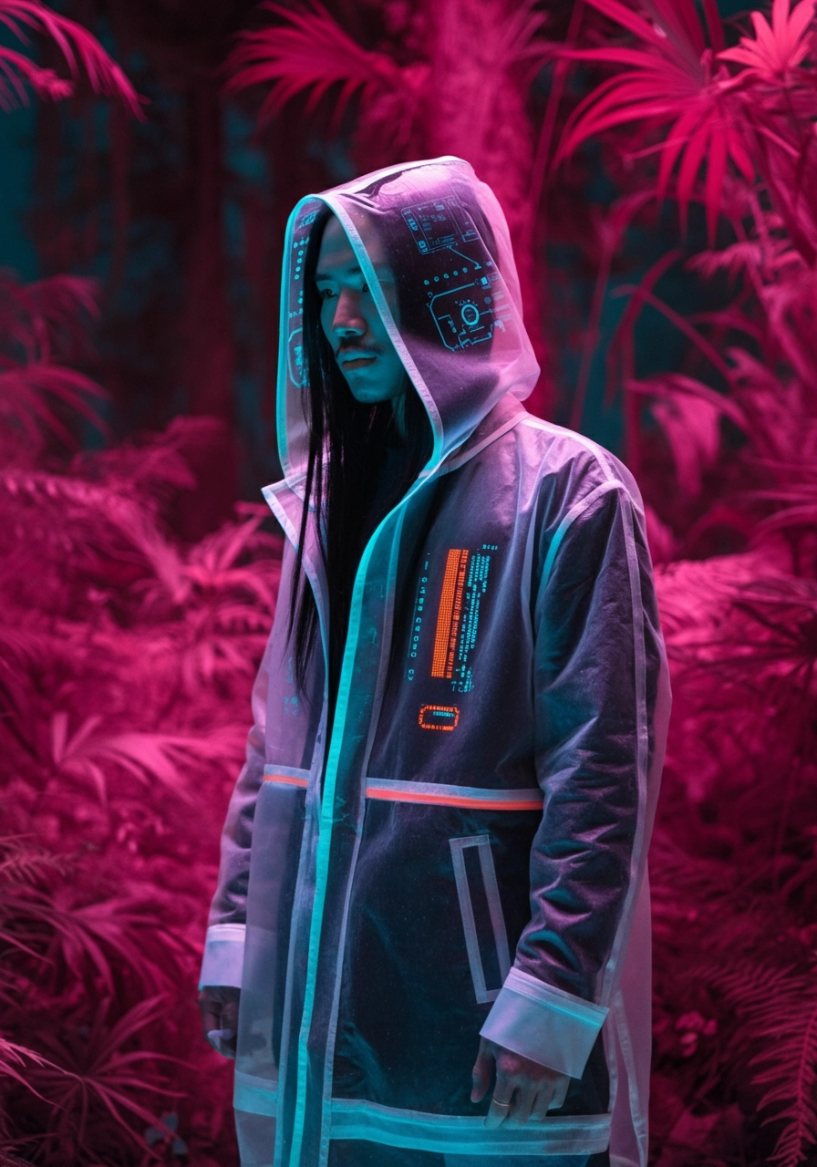 a futuristic fashion portrait of a man wearing a translucent, high-tech coat with neon blue and orange details against an overgrown jungle. at night time. moonlit.. The design should blend traditional cultural elements with modern technology, featuring a tech-infused hood with integrated digital features. The image should have soft, elegant lighting that highlights the smoothness of her skin and the vibrant, innovative details of her attire. The overall composition should emphasize a mix of cultural heritage and futuristic design, together with the fact that she is a hacker.