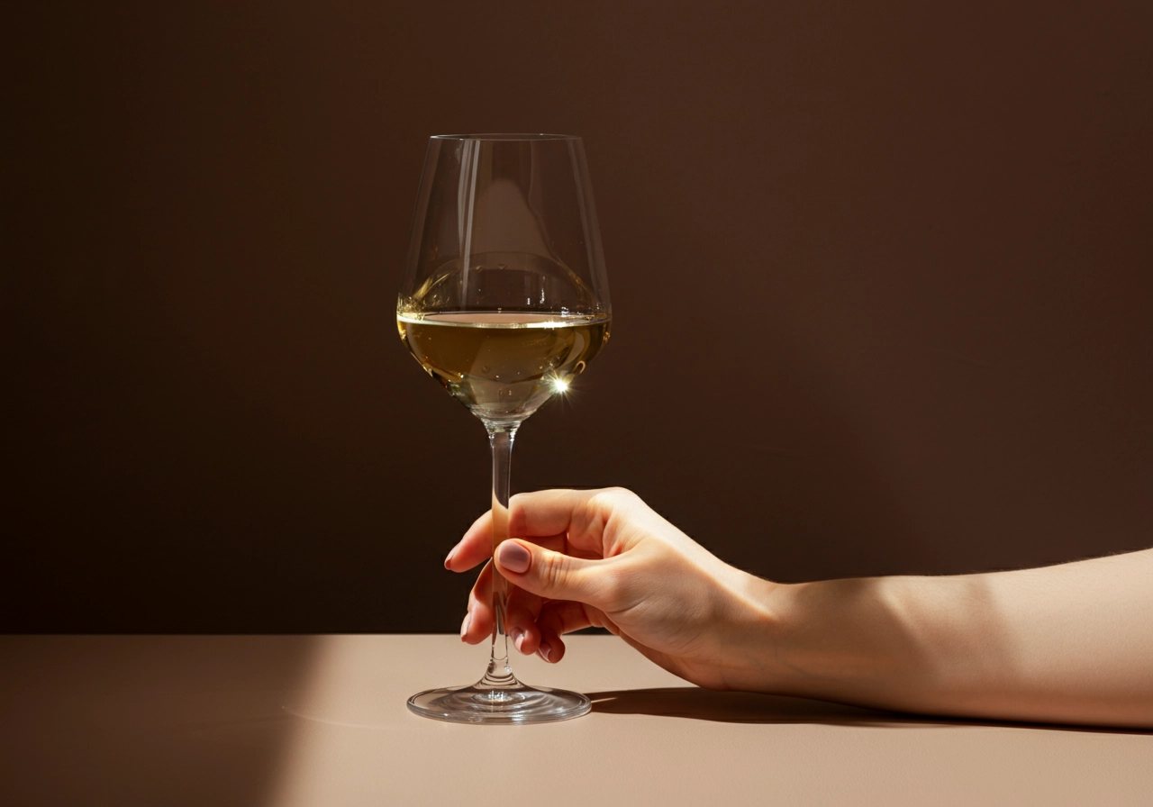 A photograph of a delicate woman's hand holding the stem of a glass of white wine, set against a minimalistic background in a dark beige. The scene is well lit with soft light. Her arm rests on a darker beige table and casts a gentle shadow. The composition focuses on the graceful gesture, highlighting the drink's clarity. The perspective is side-on, capturing an elegant and serene atmosphere.