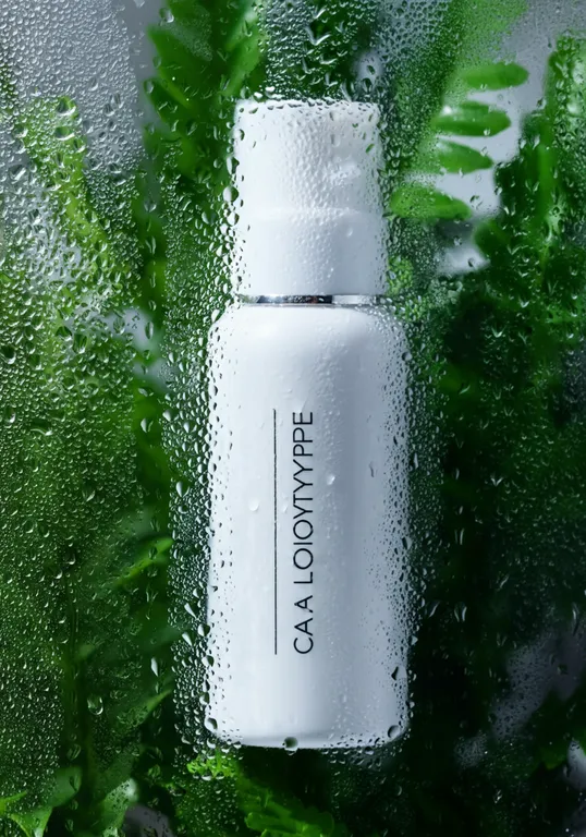 A high-quality, photorealistic editorial photograph featuring a minimalistic skincare product in a white cylindrical bottle. The product is placed behind a fogged glass surface with water droplets, creating a soft, dreamy effect. Delicate green leaves are visible through the misted glass, adding a natural, organic feel to the composition. The lighting is soft and diffused, emphasizing the gentle textures and muted tones, while maintaining a serene and refreshing atmosphere. The focus is on evoking a sense of purity, calm, and eco-friendly elegance, ideal for a high-end skincare brand