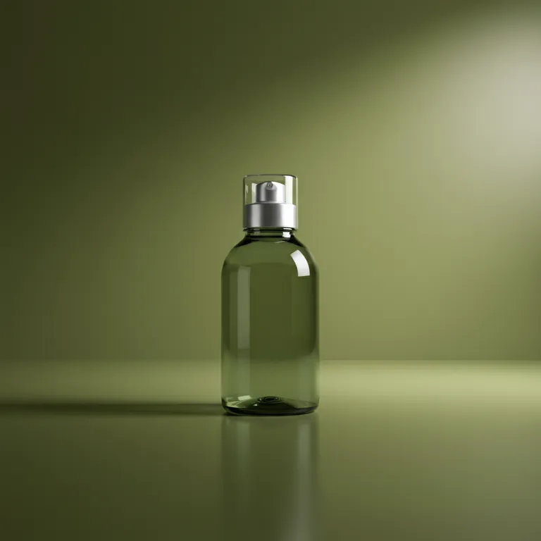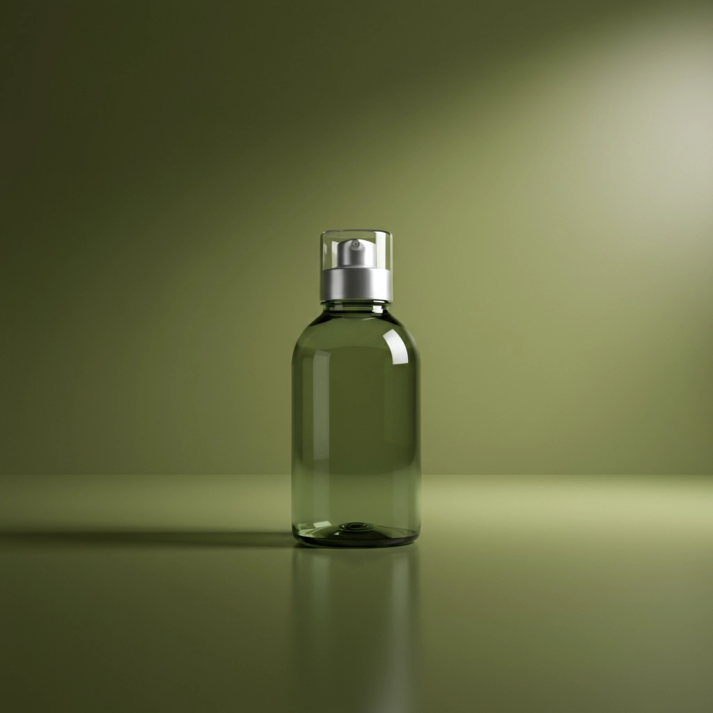 a top angle view of a transparent bottle placed on a clean surface with a soft reflection and realistic shadow beneath it. The overall aesthetic follows an olive green theme, with subtle gradients or background elements in varying shades of olive green. The lighting is soft and diffused, highlighting the clarity of the bottle while maintaining a natural and elegant look. Minimalist and modern composition, suitable for high-end product display.