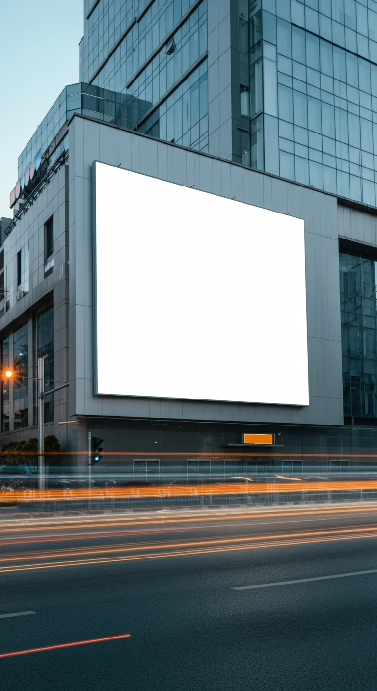 Large blank white billboard on the wall of a large commercial building with glass windows reflecting the sky. At the bottom of the photo we have light traffic passing through the avenue