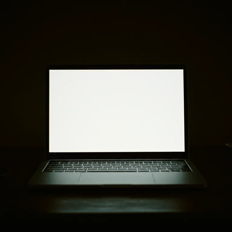 A laptop sitting on a table with a blank white screen against a dark background, with minimal lighting highlighting the laptop.